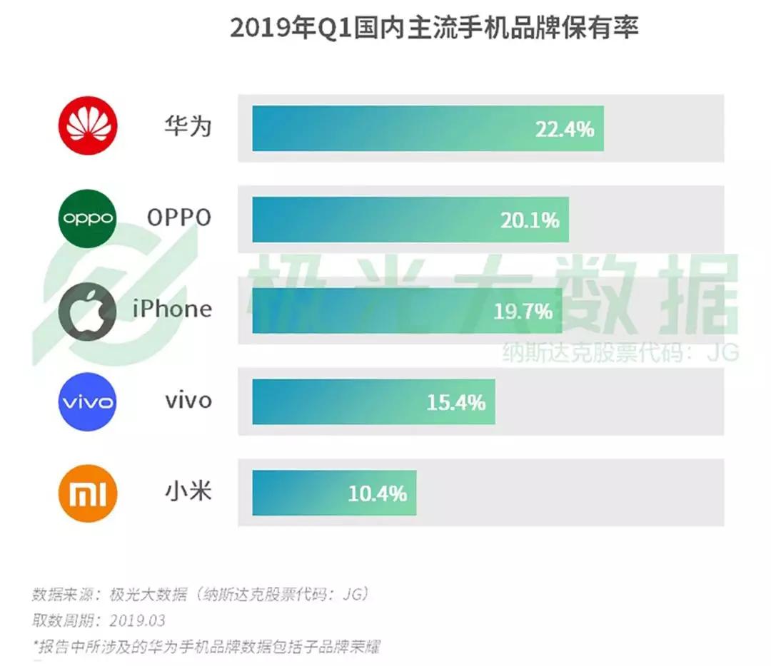 极光大数据显示,2019年Q1国内保有率前五的手机品牌分别为华为、OPPO、iPhone、vivo和小米,其中华为以22.4%的保有率排名第一