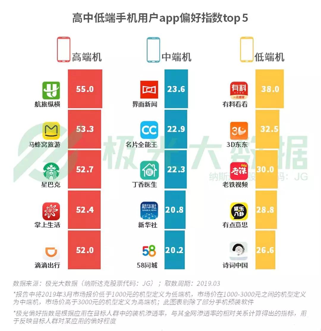 极光大数据显示,高中低端手机用户最偏爱的app分别是航旅纵横、界面新闻和有料看看