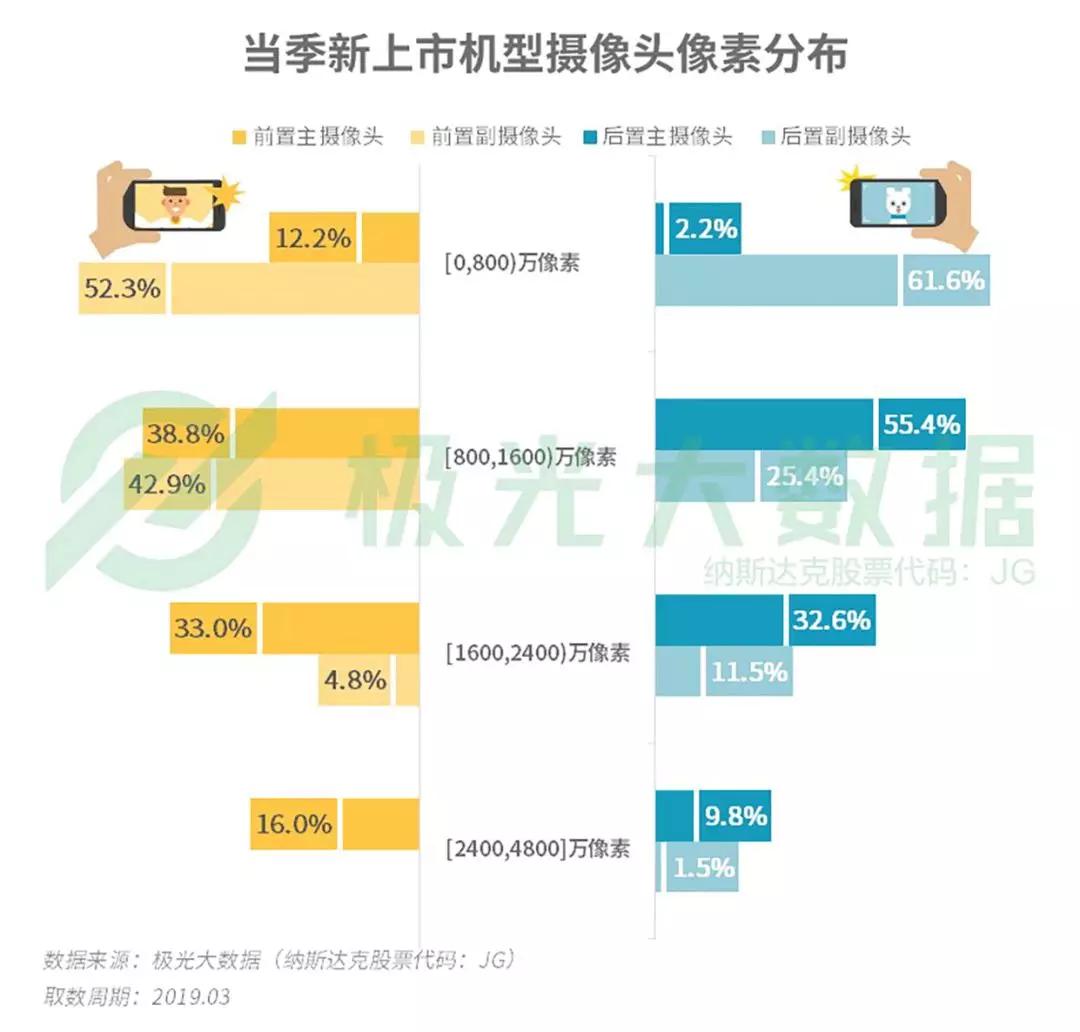 自拍热潮带动手机前置摄像头升级,前置主摄像头像素在1600万及以上的占比达到49%