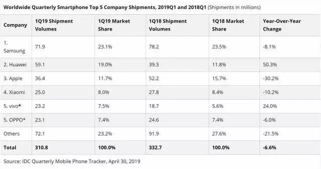 其中,在IDC最新的2019年Q1全球手机销量报告中,华为以5910万部出货量站稳了世界第二大手机供应商的位子,而小米、OPPO和vivo则分别位列第四名和并列第五名。