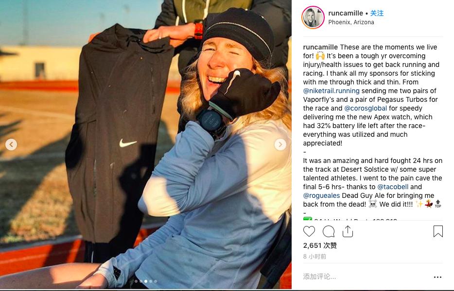 Camille Herron当时佩戴着COROS APEX,在24小时中完成了262公里的连续跑步,而从去年秋天开始,她带着APEX进行训练。