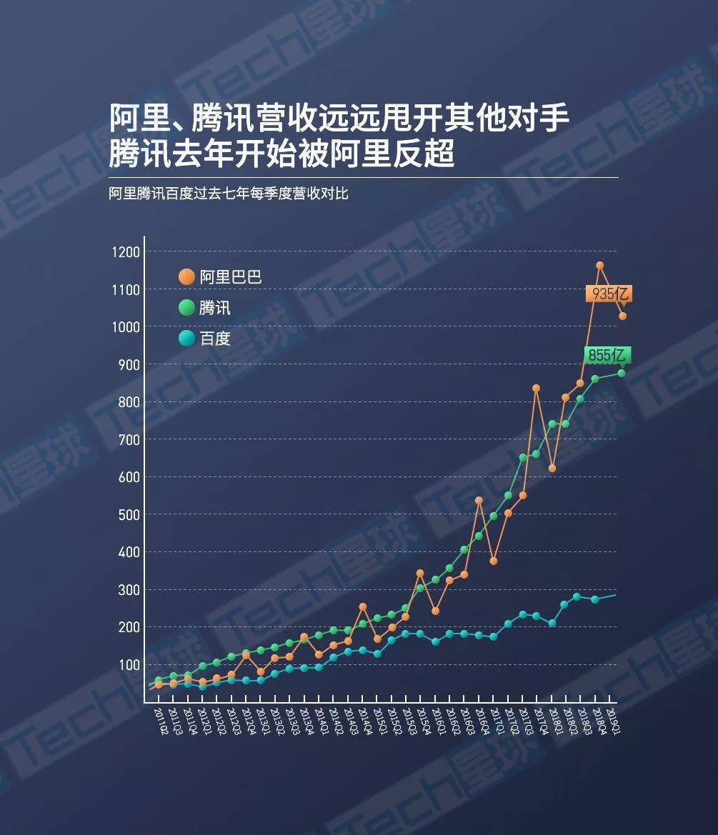 当然马云“忽悠”了卫哲,因为此后虽然从2009年至2010年,阿里每年营收增长的速度平均为58%,一直超过腾讯的43%,并且两家公司都在2015年突破了千亿营收大关,但是阿里整体营收直到2016年才超越腾讯的营收。