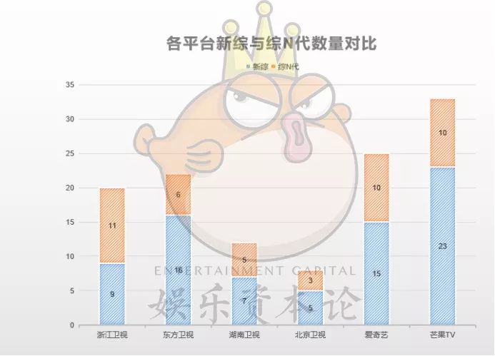 以综艺立台的浙江卫视和东方卫视成为卫视中综艺数量最多的两家。不同的是,综N代在整个综艺布局中的占比。浙江卫视以综N代数量高达11档,新综仅9档。综N代展现出强劲的吸金能力。