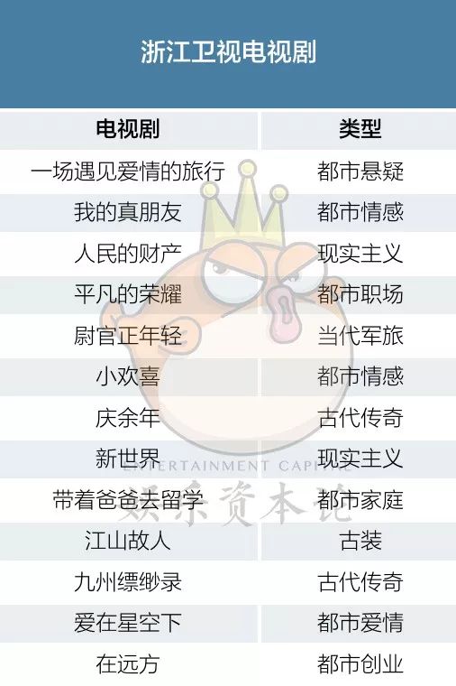 浙江卫视拿出的13部剧中,9部为现代剧,占比近70%,1部年代或近现代戏,古装剧3部,已经是各大卫视中古装剧数量最多的一家。