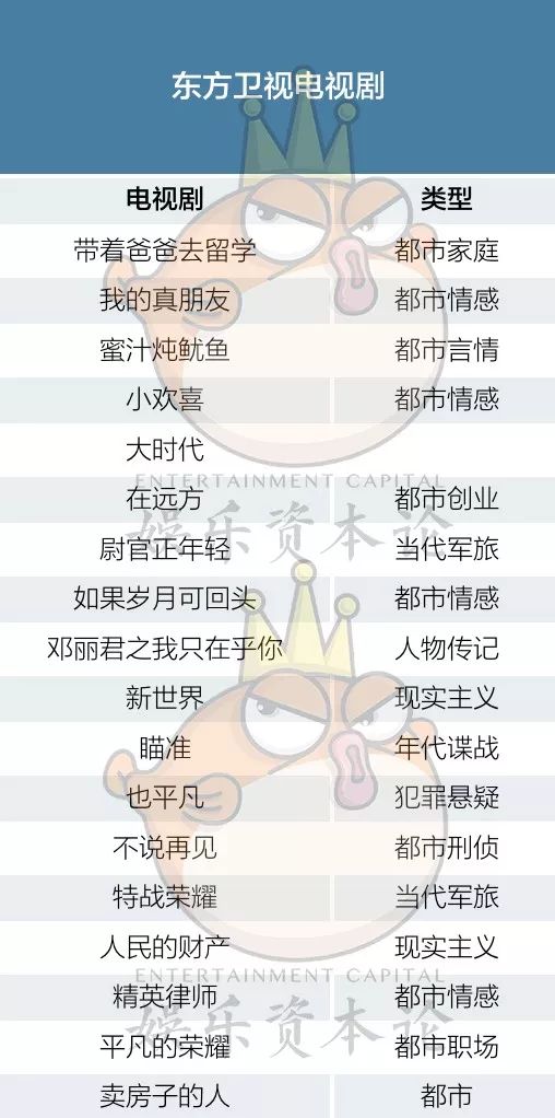 东方卫视2019下半年的黄金档完全由现代都市和几部年代戏填满,18部剧中都市题材的剧集有14部,占比高达87%。其实这也符合东方卫视电视剧一向走的摩登时尚路线,18部电视剧在题材上涵盖了都市偶像、创业、职场等,现实主义与偶像并重,比如聚焦房地产中介和留学的社会话题,十分契合上海这座一线城市受众的口味,几部年代谍战、刑侦和当代军旅剧,也巧妙地成为献礼剧目。