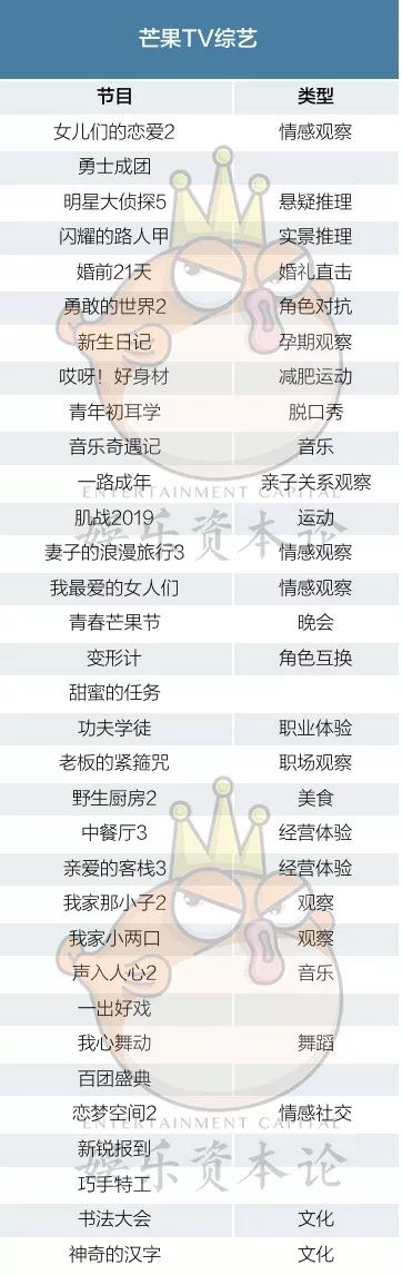实际上,不仅各大卫视难以在头部节目上与《奔跑吧》抗衡,就连爱奇艺S+级节目《中国新说唱》都难以达到前者的吸金能力。根据刊例显示,《新说唱2019》的整体招商金额在6亿左右,与《奔跑吧》差距较大。但在腰部及以上新综的刊例定价来看,以《潮流合伙人》《做家务的男人》为代表的节目整体招商金额在3亿和2.5亿左右,是能够达到类似《跨界歌王》《中国梦之声》此类电视A级节目的。而从数量上来说,爱奇艺与芒果TV的综艺数量远远高于卫视平台,虽然这意味着高投资、高风险,但同样有高回报的可能,至少与卫视相比,视频网站能提供更多元的题材和有趣的玩法。