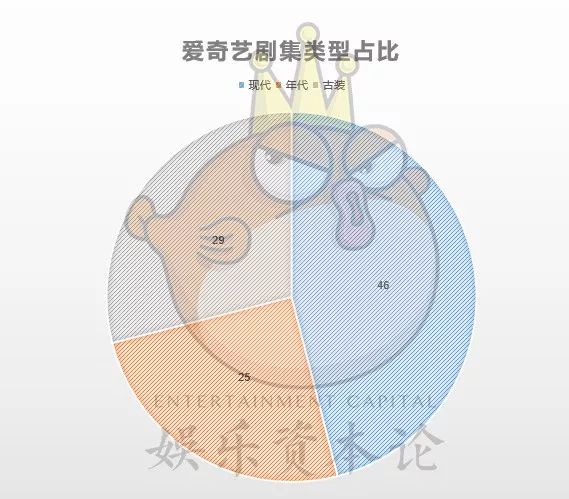 相较于卫视的单一,视频网站在类型和数量上呈现出百花齐放的状态。爱奇艺公布的29部剧集中,现代都市题材占比低于50%,这与卫视的情况大相径庭。政策虽然限制了权谋宫斗剧在视频网站的生长,但《听雪楼》这样的古装新武侠、玄幻等剧依然可以在这里找到土壤。其中,爱奇艺的古装剧占比达到29%,年代戏占比25%。其中民国传奇、奇幻冒险等都是卫视欠缺的品类。