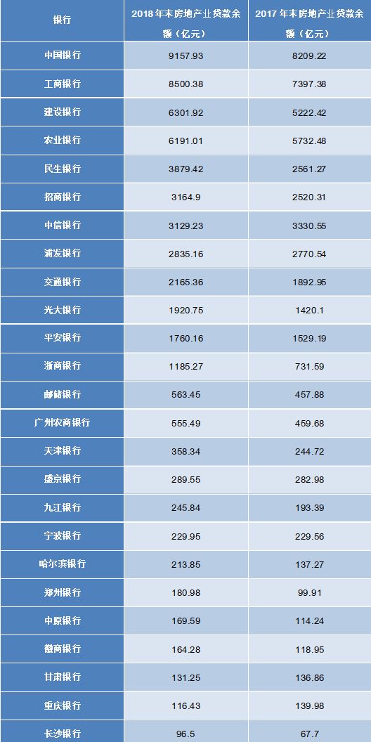 为了了解银行对房地产公司贷款的全貌,我们统计了截至4月10日33家披露年报的上市银行2018年末的房地产业贷款余额。