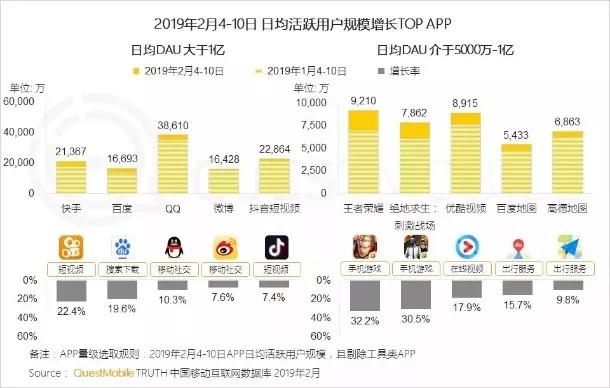 2018年底的数据来看,抖音的DAU达到了2.5亿,快手的DAU则在1.6亿水平,而根据QM的数据来看,快手在春节期间也突破了2亿DAU。