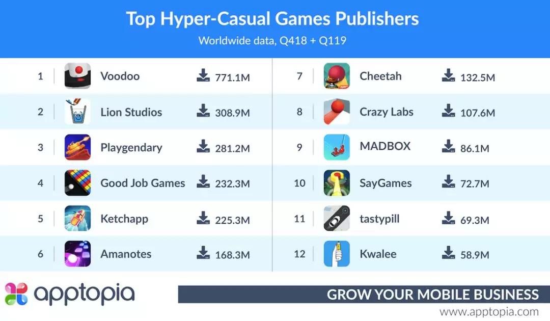 Apptopia统计了2018年 Q4 和2019年 Q1 的数据,发布了一份全球超休闲游戏发行商 TOP12 榜单,Voodoo 拿下下载量 TOP1,下载量7.71亿次,是排名第二的Lion Studios近1.5倍。