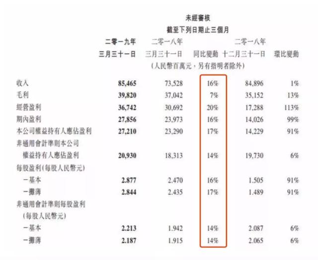 不难看出,2018年腾讯Q1利润表的各项数据中,都保持了30%~60%的增幅,而到了2019年Q1,利润表增幅都在20%以下,可以说,没有游戏业务的腾讯非常难捱。