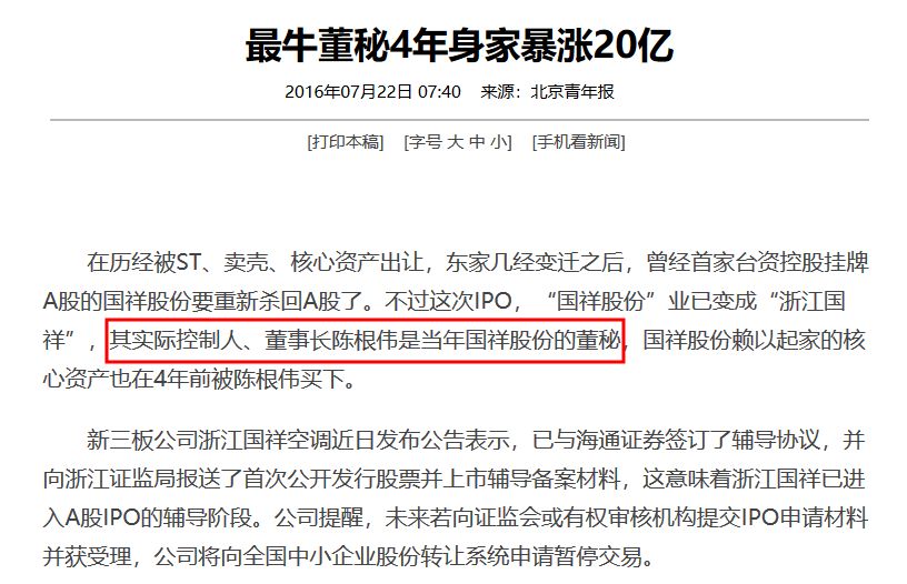 就以2016年浙江国祥的陈根伟为例,短短几年时候,通过资本运作和经营,从董秘玩到了身家数十亿的董事长,被称为“最牛董秘”,可以说是大出风头。