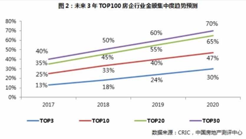 跨越一道规模就意味着更高的市场占有率,早在2017年克尔瑞发布的房企行业集中度预测显示,头部房企的市场占比呈逐年上升趋势,到2020年房企TOP3预计市场份额能占到30%,而TOP30将占到70%。