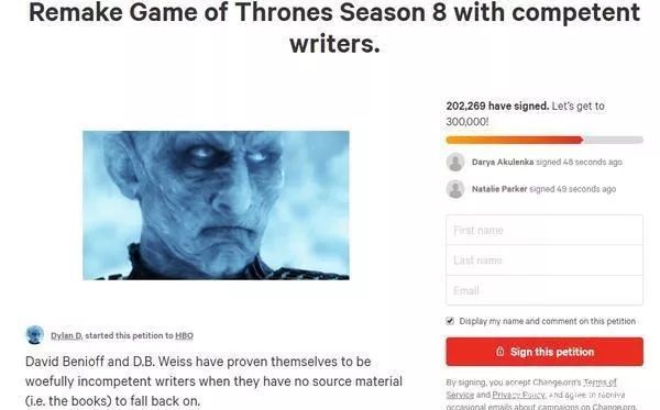 爱之深,责之切,国外网友们已经开始发起了「重拍《权力的游戏》第八季,并更换编剧」的请愿活动,目前在请愿网站 chang.org上,已经有超过 20 万人支持这个请求,而人数目前还在快速增长中。在页面上,有请愿者就疯狂的 diss 两位编剧:「两位编剧在没有原著可依赖的情况下,已经证明了自己就是可悲又无能的作家。」