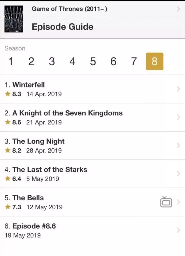 这部由 HBO 拍摄的电视剧在第八季正式开始口碑崩盘,尤其是第四集和第五集播出之后更是急剧下滑,在 IMDB 评分只有 6.4 和 7.3 分,要知道此前的单集评分最低也有 8.2 分。而在国内的豆瓣,《权力的游戏》评分也大幅下滑,首次跌破 9 分。