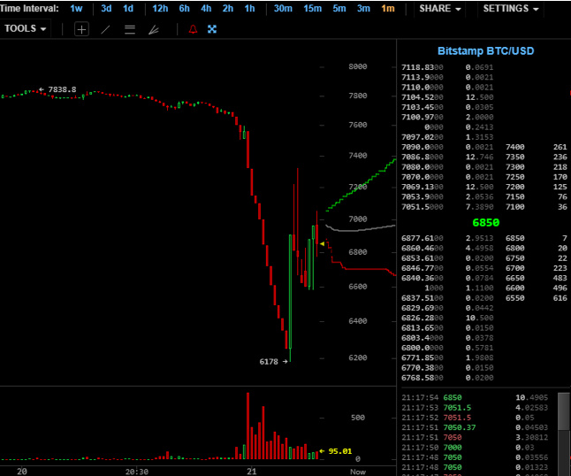 2、Bitstamp深度极差,立刻发生断崖式下跌 ;