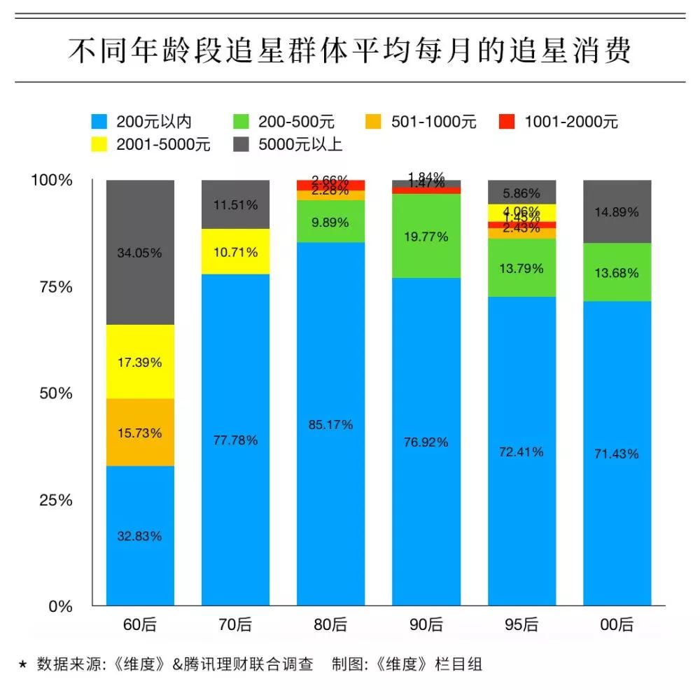 在消费频率和强度方面,腾讯理财做过一次调查,显示69.04%的粉丝都曾为爱豆埋单,4.67%的人月度消费超过5000元,36.36%单笔消费超过2000元。