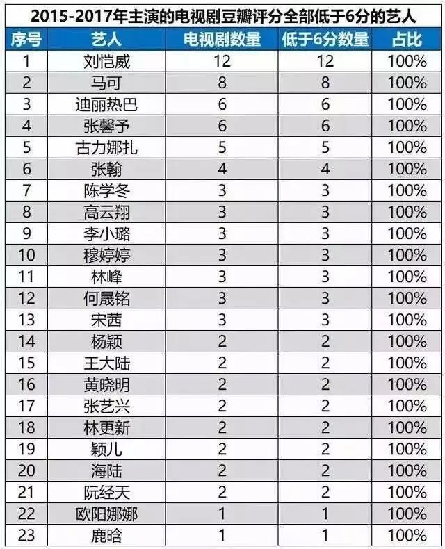 有好事者专门统计过23位明星的豆瓣电视剧评分,发现6分以下的烂片占比达到100%,迪丽热巴、古力娜扎、陈学冬、张艺兴、黄晓明、鹿晗等人都在列,但他们的商业价值有损失吗?