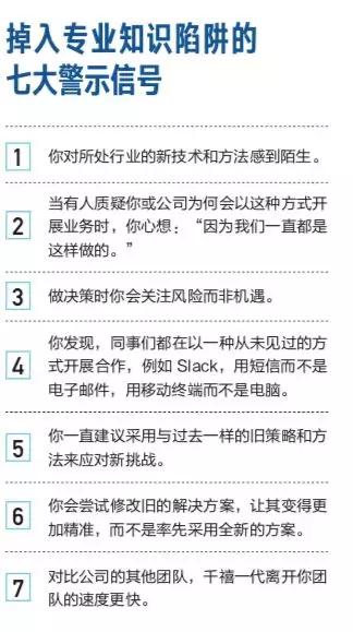 陷入专业知识陷阱的领导者与管理者不仅对新理念视而不见,而且还会停止实验,更不会冒风险。这样最终会让他们走向失败,因为他们很少学习新事物。走出舒适区,不畏惧失败,不断挑战自己的极限十分重要。