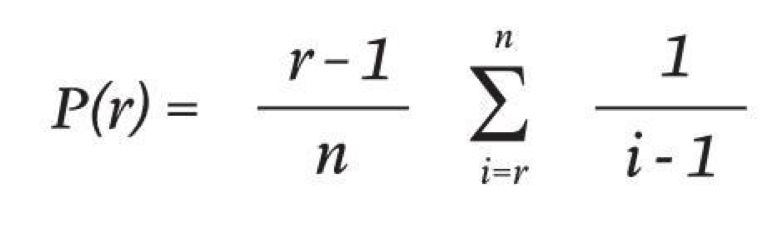 你停止找寻并和最佳人选安定下来的概率(用P代表),与潜在恋人(n)中被你拒绝的人数(r)是相关联的,公式如下: