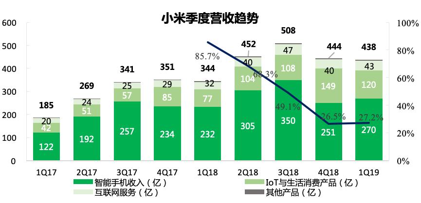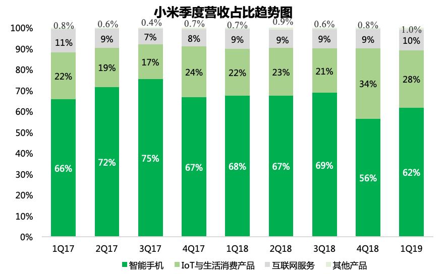 目前,IoT业务是小米的第二大收入贡献来源地。财报显示,截至2019年第一季度,IoT与生活消费产品对总营收的贡献达到27.5%,虽然较上季度的占比33.6%有所回落,但仍然录得了2017年以来的第二高,充分显现了IoT业务对小米的重要性。