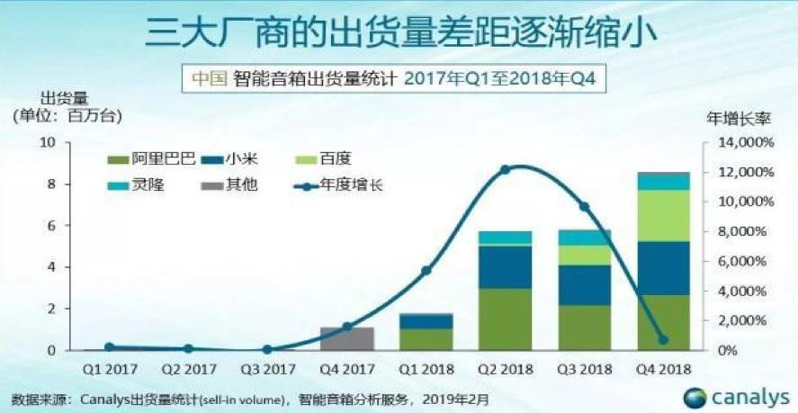智能家电方面,截至2019年3月31日,小爱音箱累计出货量已经突破了1000万台,根据数据统计机构Canalys公布的数据显示,截至2018年第四季度,小米智能音箱出货量位居国内第二位。