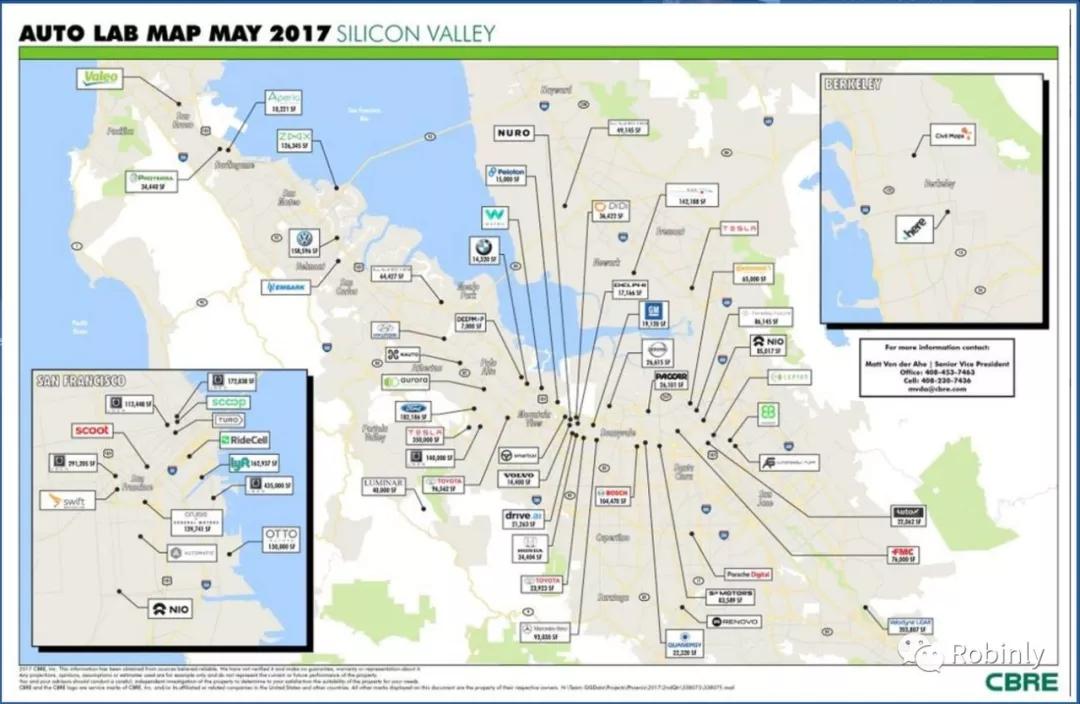 上图是2017年硅谷商业地产公司CBRE做的北加州汽车技术相关公司的分布图,我们很吃惊的发现,硅谷的汽车公司竟然如雨后春笋般冒了出来,达到400多家。