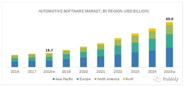 由于行车电脑的发展,安全和功能安全以及不断变化的车辆架构带来了巨大的计算平台需求,从而促进了汽车软件市场的增长。据MarketsandMarkets的统计,2018年全球汽车软件市场已经达到187亿美元的规模,据估计,自2019年到2025年,汽车软件市场年增长率将保持达18.12%,预计到2025年达到600亿美元的规模,这个增长率是非常令人震惊的,汽车业在催生新的软件巨头。