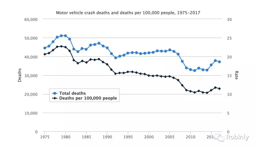 1975年-2017年全美交通事故死亡统计:总计死亡人数,以及每10万人死亡人数