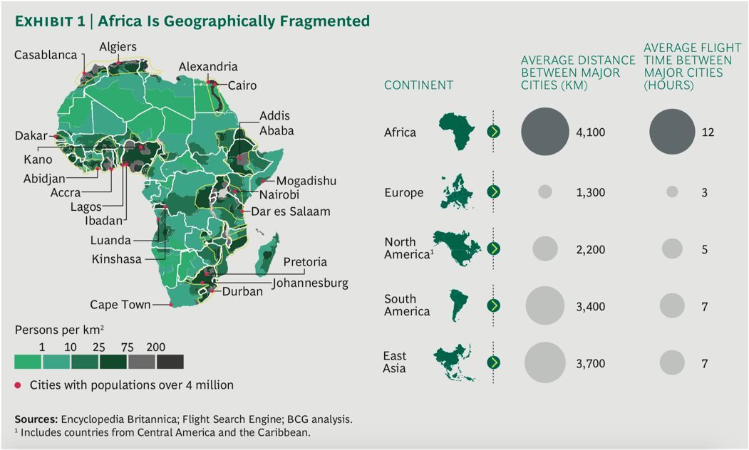 非洲16个内陆国家,其物流发展极其依赖毗邻的沿海国家。非洲主要城市之间的平均距离是4100公里,主要城市(人口超过400万)之间的飞行时间平均是12小时,为世界上耗时最长的地区。