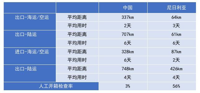 通过2018年中国和尼日利亚物流水平进行对比发现,虽然中国和尼日利亚进出口所需平均天数不相上下,但在同样的时间里运输的距离,中国是尼日利亚的5到10倍,同时尼日利亚人工开箱检查率明显高于中国,拖慢了通关的效率。