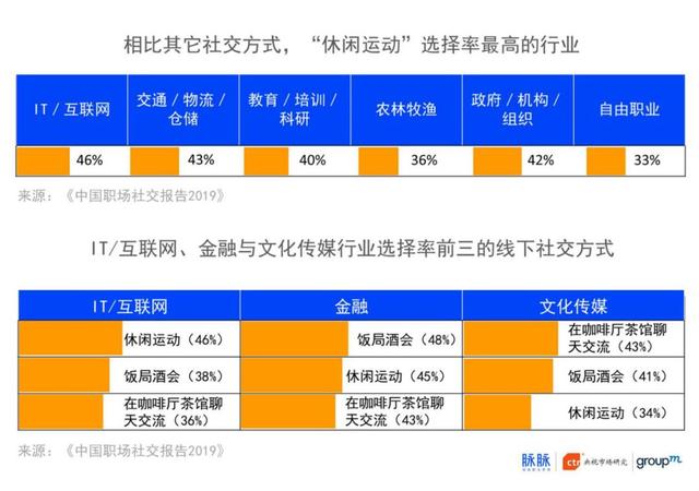 饭局和酒会仍推不掉,但就线下社交方式而言,不同的行业差异明显。综合所有行业来看,饭局和酒会仍是职场人最常用的线下职场社交方式,但分行业看,互联网人最爱的社交方式是运动;虽然金融行业对运动的偏爱度也很高,但排在首位的仍是饭局酒会;而文化传媒行业的职场人,则将在“咖啡厅茶馆聊天交流”作为了首选。