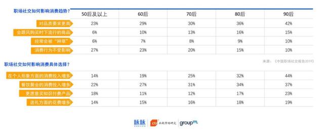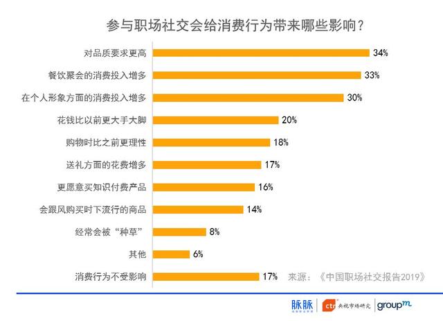 职场是群体效应的试炼场和示范效应的引力场。职场社交带动消费升级。职场社交对职场人消费行为影响最大的是:对品质要求更高,在餐饮聚会和个人形象方面的消费投入增多。越年轻,职场人的消费行为越容易受到职场社交影响。因职场社交的影响而被“种草”,或是跟风购物的情况,随着年龄降低而愈发明显。