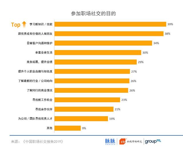 报告发现,中国职场人已经开始摆脱“社交=搞关系”片面理解,除了建立连接,积累人脉外,还希望通过职场社交来提升自我,构建更好的职业脉络。除了人脉,个人成长职业脉络构建也同样重要。在被问及参与职场社交的目的时,收获成长(学习新知识/技能)和人脉(跟优秀或有价值的人做朋友)是占比最高的两个选项。