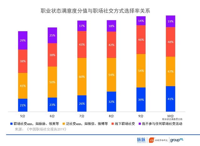 调研显示,在职业状态满意度5分及以上人群中,满意度越高的职场人,职场社交类App的使用率存在升高趋势。