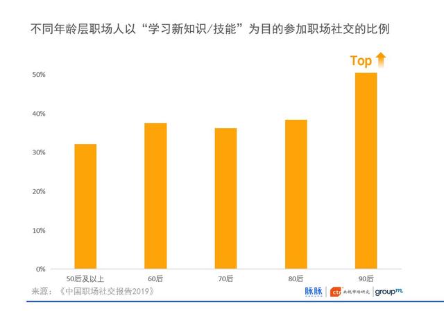 当代职场人面对快速更迭的知识与技能,在能力提升方面承受较大的压力,高达50%的90后人群希望通过职场社交来学习新知识和技能,在所有年龄组别中占比最高。