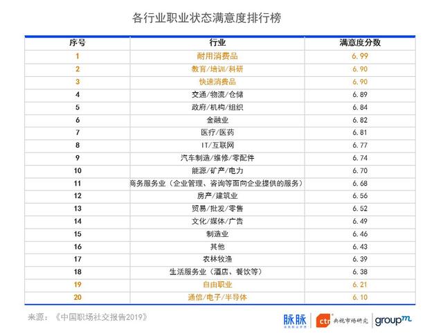 分行业来看,耐用消费品、教育/培训/科研与快速消费品三个行业的职业状态满意度最高,通信电子排名垫底,而自由职业者的满意度也较低,看似自由的状态,实则要面对不少挑战。