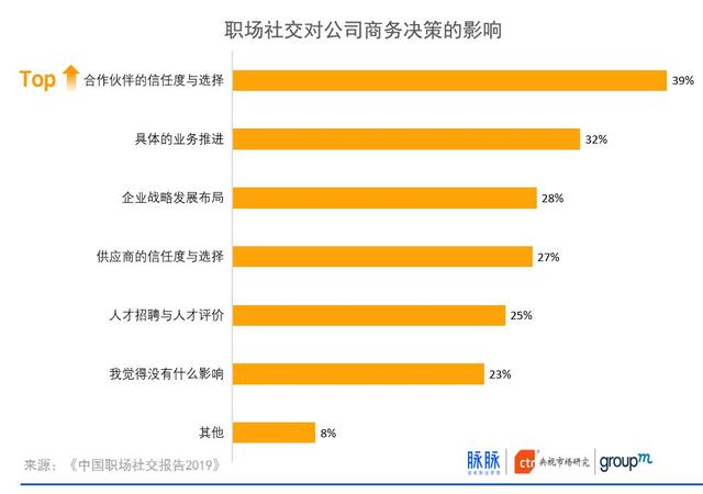 职场社交是商业信任的重要一环,深刻影响商业生态。参与职场社交对企业商务决策影响最大的三个方面分别是:合作伙伴的信任度与选择、具体的业务推进和企业战略发展布局。