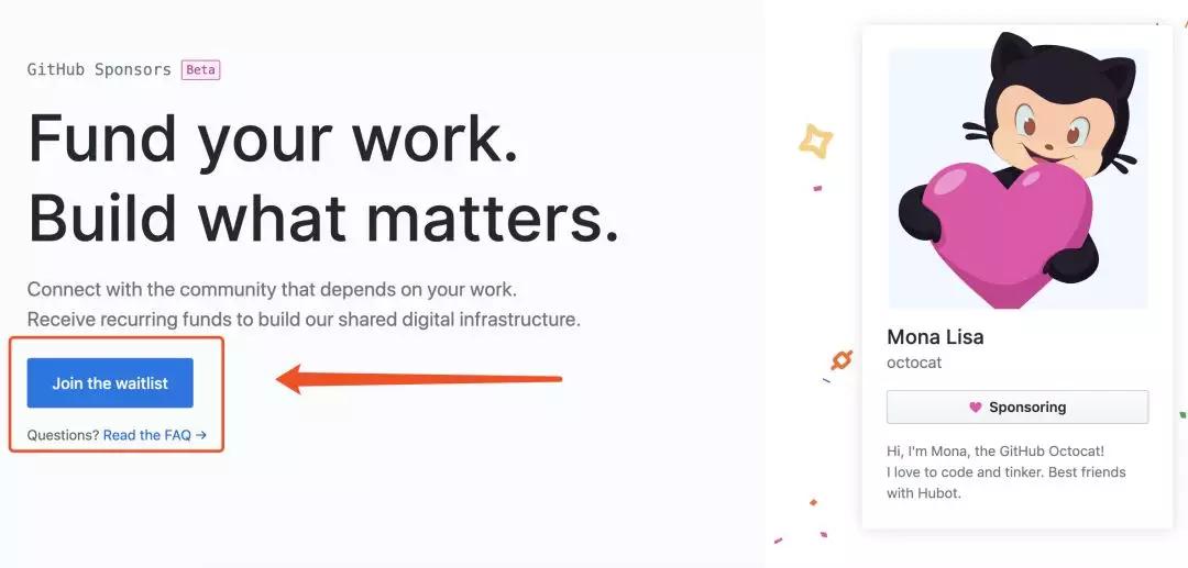- 若是你在GitHub上已经挂上去了开源项目,并且有一定“粉丝”的拥护,便可以考虑进入下方链接,点击“Join the waitlist”并填写信息来申请“被打赏”。