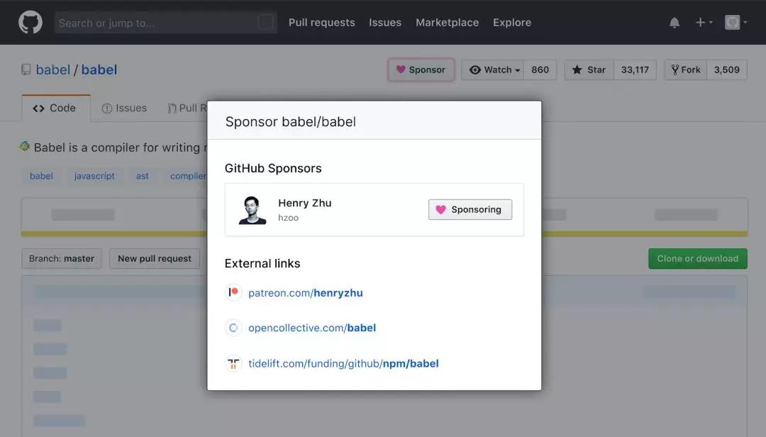 任何拥有GitHub帐户的人,都可以向开通赞助商资格的账户进行赞助。类似于“Buy them a coffee”,只不过赞助是定期的,可以选择分年付或月付,月付金额和收益由接受赞助的开发者设置。