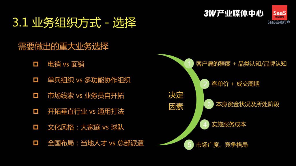 在确立了上述规范后,企业还需要对业务方式做出重大的选择。这些选择包括企业是需要选择电销还是面销,需要进行单兵组织还是进行多功能协作组织,更侧重于市场线索还是更依靠业务员自行开拓线索……