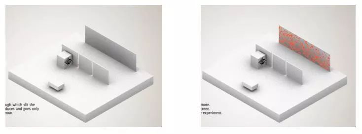 如果在刚才的狭缝前,安装一个探测器,看看电子到底是怎么通过狭缝的,那么我们会发现,它只会通过一个狭缝。而这个时候,最后挡板上呈现的就回到了粒子性的完全随机分布,不再出现明暗条纹了。