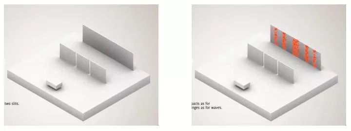 这就告诉我们,这些电子在出发和到达的时候表现得像粒子,但在穿越狭缝的时候却像波一样,它能够同时通过两个狭缝。电子在这个过程中既表现了粒子性,又表现了波动性。