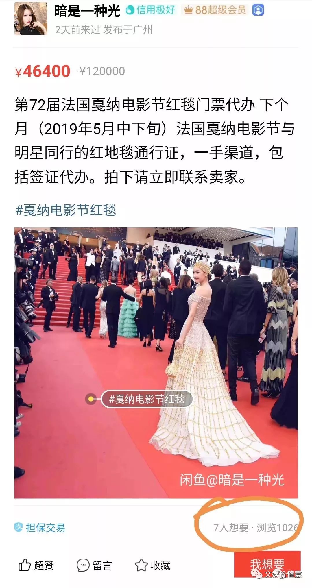 虽然戛纳官方称邀请函不会对外出售,但是邀请函在网上可以进行交易,有收到邀请的艺人会私下进行出售。在闲鱼上搜索“戛纳红毯邀请函”,甚至可搜索到定金1万,含开幕式、走红毯、特约摄影师、酒会邀请函一条龙服务。就这样,不需要任何电影作品,只要10万元,戛纳红毯照你就能带回家了。