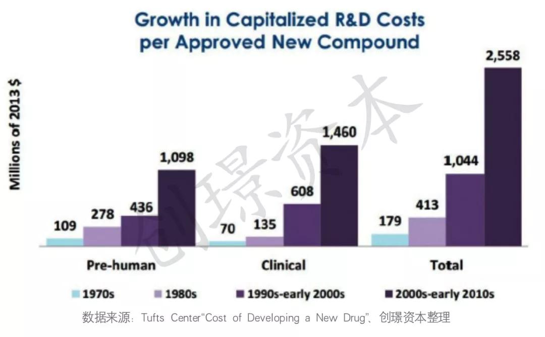 首先,发现一个更安全、更有效的新化学分子实体已经非常困难,耗资巨大,成本还在不断上升中,世界大型制药公司纷纷把注意力转向对已有产品的新剂型开发上。众所周知,一个新药的诞生需要超过10年的研发周期及超过10亿美金投入,并且随着成功率的降低、临床试验成本提高、监管加严等因素影响,新药的开发成本愈加昂贵。如下图Tufts Center的数据统计,近数十年来开发成本呈现爆发式的上升。相较之下,开发一个已有药物的新剂型,平均只需花费5000万美元左右。