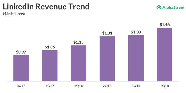 在18财年,LinkedIn的营收约为53亿美元,盈利6亿美元。LinkedIn的收入同比增长29%。这种趋势可能会继续下去。LinkedIn拥有约2.6亿MAU和近5亿注册用户——达到了Facebook用户的八分之一。