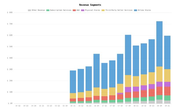 18财年,亚马逊在线商店的收入约为1220亿美元。众所周知,亚马逊在这部分业务中没有任何盈利。其在线商店的增长正在减速。该业务同比增长18%左右。