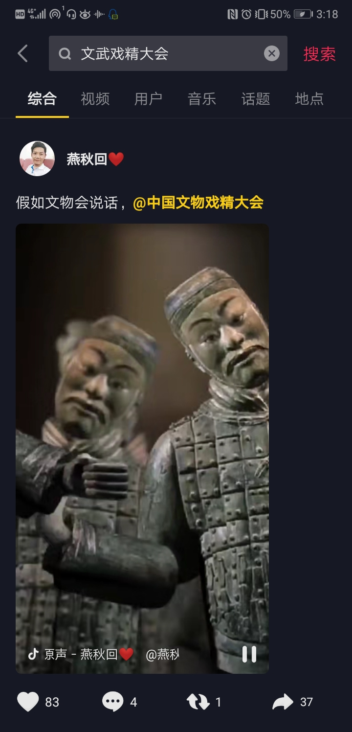 除此以外,为了积极迎合近年来全国各地的“文博热潮”,陈海峰和团队还积极对接全国各省市的博物馆,让一件件厚重的文物通过专业团队的特效制作,称为一个个能讲故事能卖萌的“文物戏精”。而抖音与全国各大博物馆共同制作的“文物戏精大会”一经投放就成为了大家关注的焦点,上线仅仅4天播放量就突破1.18亿,抖音“文物戏精大会”一跃成为新网红。而这样一种对传统文化传播的尝试,不仅提升了各地传统文化的知名度,也成功为首批七家博物馆吸粉导流。