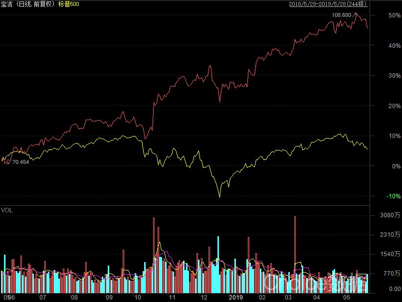|图:(2018.05-2019.05)宝洁股价和标普500指数走势对比。资料来源:Choice数据