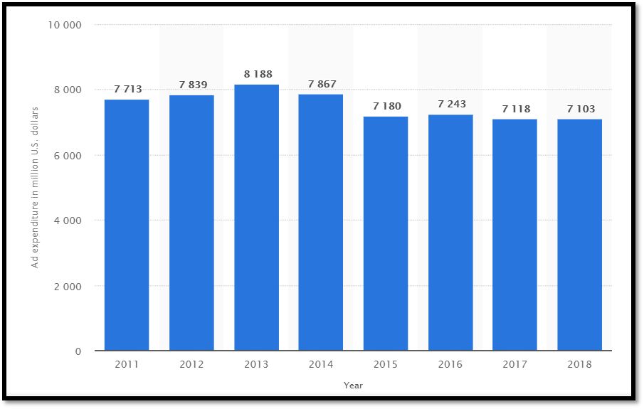现实当中,宝洁也是这么做的。宝洁是无可争议的“广告之王”,根据数据统计网站(www.statista.com)的统计显示,从2011年到2018年,宝洁的广告支出一直维持在70亿美元以上。